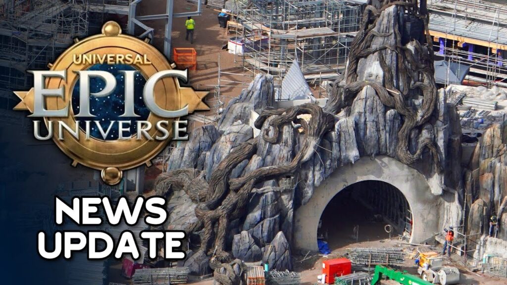 Yoshi’s adventure and more let’s check in on those construction milestones and additional work happening all around the Epic Universe site in today’s news Update jumping right in the scaffolding has come down around the portal Into the Dark Universe land the area we believe will be themed to the universal monsters as we first described last year this incredibly detailed rockwork themed entry portal is covered in wrapping tree roots which have taken hold around the